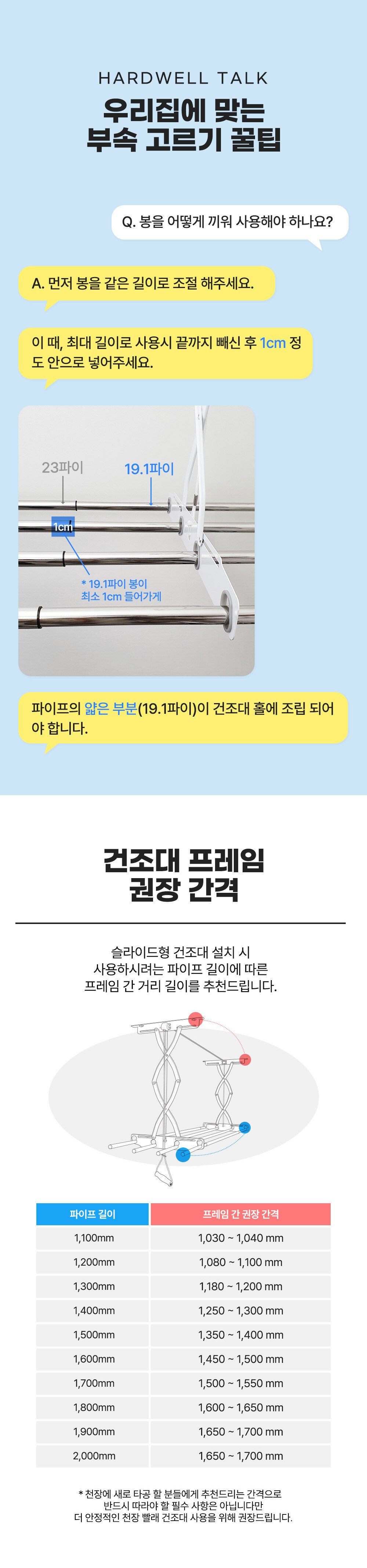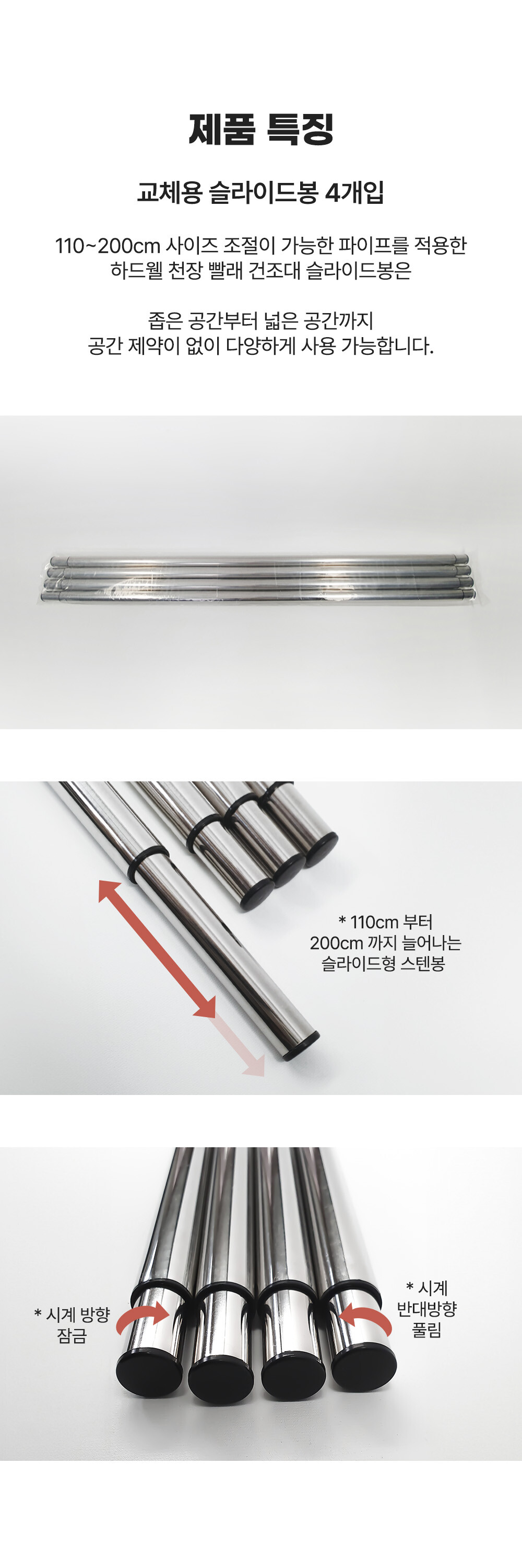 공간 제약 없이 새롭게 디자인된 천장 빨래 건조대 슬라이드봉은 사이즈 조절이 가능한 파이프를 적용하여 좁은 공간부터 넓은 공간까지 효율적으로 사용이 가능합니다.
